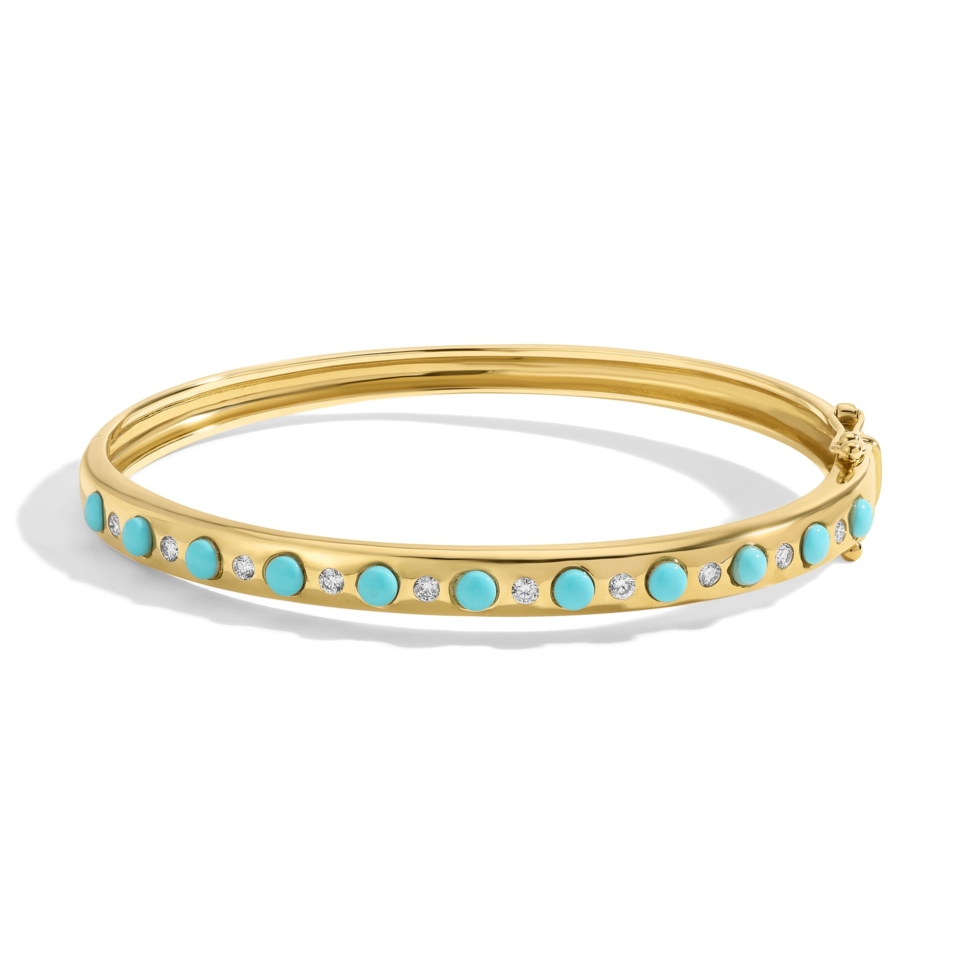 Infused with vibrant color and timeless elegance, this 14kt Gold Bangle with Turquoise & Diamonds is designed to captivate. Each turquoise stone and sparkling diamond is set along the luminous gold band, creating a rhythmic pattern that shimmers with every movement. The serene blue of the turquoise is perfectly complemented by the brilliance of each diamond, making this piece a striking addition to any jewelry collection.